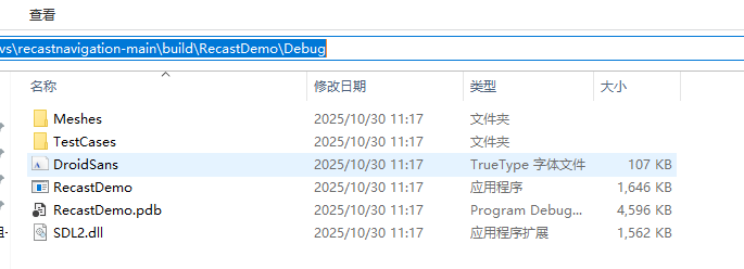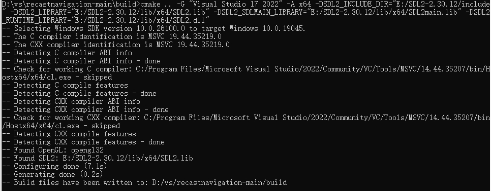 recastnavigation源代码根目录下,创建一个名为build的新文件夹。这样做可以保持源代码目录的清洁(Out-of-source build)。 - 进入build目录 ,cmd 命令行执行如下命令 cmake .. -G “Visual Studio 17 2022″ -A x64 -DSDL2_INCLUDE_DIR=”E:/SDL2-2.30.12/include” -DSDL2_LIBRARY=”E:/SDL2-2.30.12/lib/x64/SDL2.lib” -DSDL2_SDLMAIN_LIBRARY=”E:/SDL2-2.30.12/lib/x64/SDL2main.lib” -DSDL2_RUNTIME_LIBRARY=”E:/SDL2-2.30.12/lib/x64/SDL2.dll” (注意替换SDL2安装的实际路径,我这里是E:/SDL2-2.30.12/)
